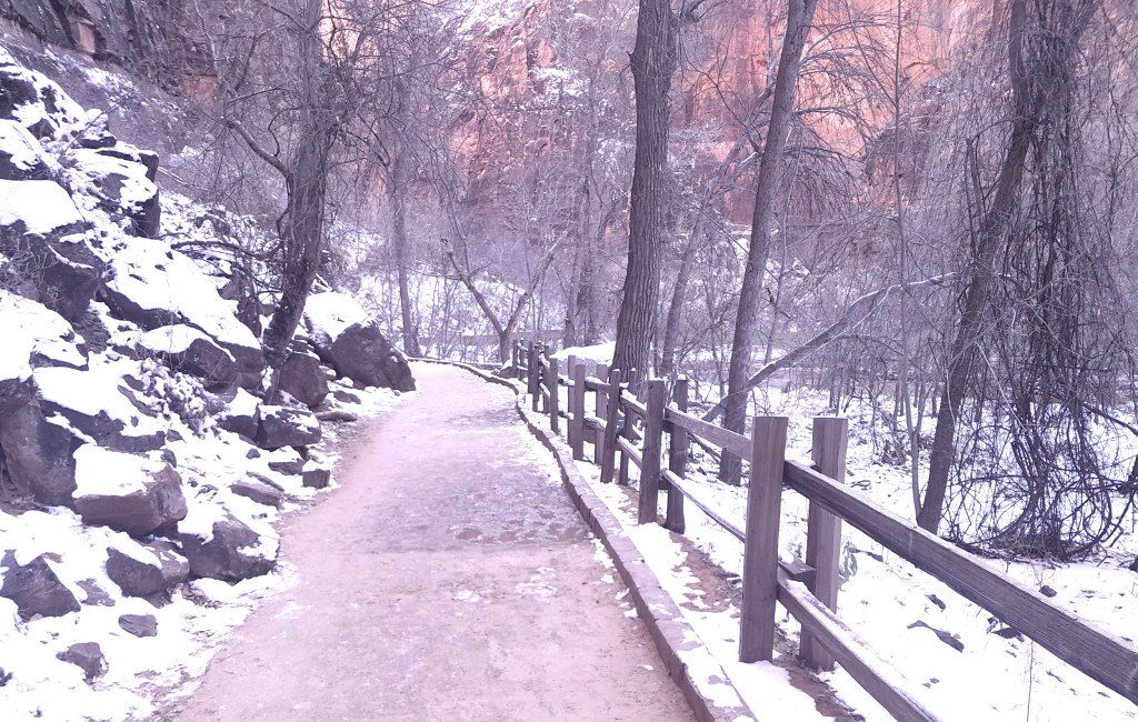 Leaving Valley of Fire behind, we embarked on a scenic drive through the picturesque Northwest corner of Arizona, heading towards Utah’s Zion National Park. Overnight snowfall had left a delicate white dusting on the landscape, creating a winter wonderland effect that added to the park’s natural beauty.