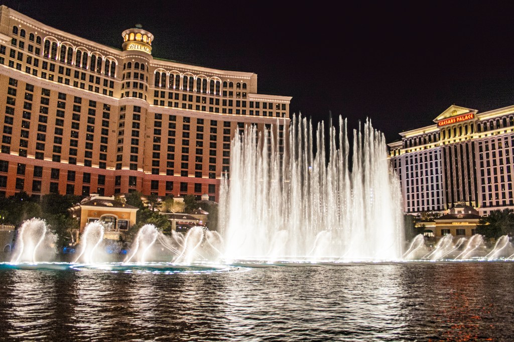 Las Vegas, USA – July 18, 2008: Las Vegas Bellagio Hotel Casino, featured with its world famous fountain show, at night with fountains in Las Vegas, Nevada.